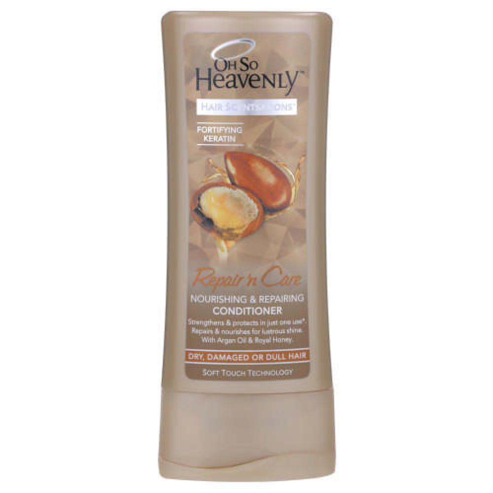 Oh So Heavenly Hair Scentsations Repair 'N Care Nourishing & Repairing Conditioner 200ml helps you say goodbye to dry hair and hello to soft feeling, nourished locks with incredible shine. Quench thirsty, fragile and damaged hair with this moisture-rich, repairing conditioner. It is enriched with fortifying keratin and argan oil to help intensively nourish, strengthen and repair hair, protecting each strand at its core against damage and split ends. Strands are significantly stronger and protected against breakage after just one use.