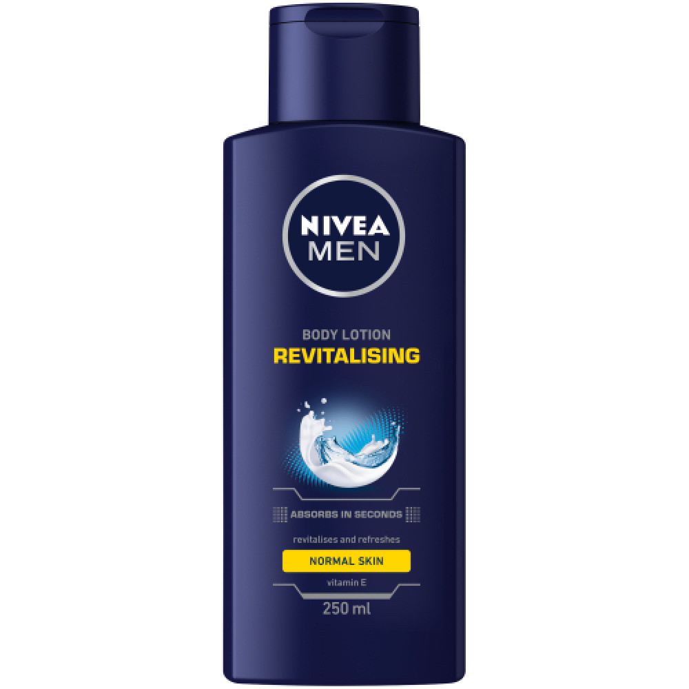 Nivea Men Body Lotion Revitalising 250ml has a non-greasy formula, enriched with Hydra IQ and vitamin E, to give your skin an extra burst of moisture. It absorbs quickly to nourish skin in an instant and leave it feeling comfortable, refreshed and revitalised. Lasting moisture for up to 24 hours.